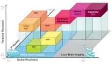 Spatial resolution of an fMRI study refers to how well it discriminates between nearby locations. It is measured by the size of voxels, as in MRI. A voxel is a three-dimensional rectangular cuboid, whose dimensions are set by the slice thickness, the area of a slice, and the grid imposed on the slice by the scanning process. Full-brain studies use larger voxels, while those that focus on specific regions of interest typically use smaller sizes. Sizes range from 4 to 5 mm, or with laminar resolution fMRI (lfMRI), to submillimeter.[28] Smaller voxels contain fewer neurons on average, incorporate less blood flow, and hence have less signal than larger voxels. Smaller voxels imply longer scanning times, since scanning time directly rises with the number of voxels per slice and the number of slices. This can lead both to discomfort for the subject inside the scanner and to loss of the magnetization signal. A voxel typically contains a few million neurons and tens of billions of synapses, with the actual number depending on voxel size and the area of the brain being imaged.[29]