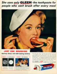 Gleem was positioned in 1952 as a competitor to top Colgate's then top Dental Cream, with advertising coordinated by Compton Advertising, Inc.[4] The League Against Obnoxious TV Commercials included a Gleem toothpaste commercial in its list of the terrible 10 in May 1963.[5] In 1958 Gleem had become number two in top toothpastes, with Colgate still first in sales and Crest in third place. By 1969, Gleem was a declining brand name. In an effort to obtain additional sales, Procter & Gamble assigned the account to the firm of Mary Wells Lawrence, Wells, Rich, Greene.[6]