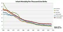 - ↑ Metrics for infant mortality vary between countries and therefore might not be directly comparable. The United States, for example, marks babies under 500g as being able to be saved and thus counts them as deaths where as Germany does not include them in their infant mortality rate. Also the infant mortality rate may be due to social factors rather than its healthcare system.