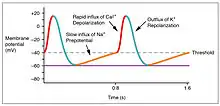 When the sinoatrial cells are resting, they have a negative charge on their membranes. However a rapid influx of sodium ions causes the membrane's charge to become positive. This is called depolarisation and occurs spontaneously.[7] Once the cell has a sufficiently high charge, the sodium channels close and calcium ions then begin to enter the cell, shortly after which potassium begins to leave it. All the ions travel through ion channels in the membrane of the sinoatrial cells. The potassium and calcium start to move out of and into the cell only once it has a sufficiently high charge, and so are called voltage-gated. Shortly after this, the calcium channels close and potassium channels open, allowing potassium to leave the cell. This causes the cell to have a negative resting charge and is called repolarization. When the membrane potential reaches approximately −60 mV, the potassium channels close and the process may begin again.[7]