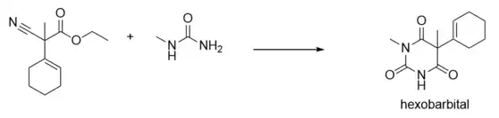 Hexobarbital can be synthesized by reacting cyclohex-1-enyl 2-cyanopropanoate with guanidine and sodium methylate. A hexobarbital sodium intermediate is then formed which can be methylated with dimethyl sulfate.[9]