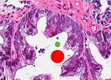-Cruz, Andrea O.; Santana, Amanda L. S.; Santos, Andréia C.; Athanazio, Daniel A. (2016). "Frequency of the morphological criteria of prostate adenocarcinoma in 387 consecutive prostate needle biopsies: emphasis on the location and number of nucleoli". Jornal Brasileiro de Patologia e Medicina Laboratorial. doi:10.5935/1676-2444.20160018. ISSN 1676-2444. - ↑ Glands adjacent to and indenting nerves is not sufficient as a diagnostic criterion by itself. Glands partially surrounding a nerve is an indication of carcinoma.