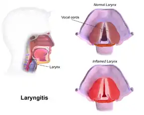Laryngitis is inflammation of the larynx (voice box).[1] Symptoms often include a hoarse voice and may include fever, cough, pain in the front of the neck, and trouble swallowing.[1][2] Typically, these last under two weeks.[1]