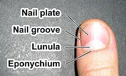 - ↑ "No half-moon on nails: What does it mean?". www.medicalnewstoday.com. 2019-06-24. Retrieved 2022-03-21.