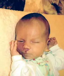 | A newborn child with M-CM syndrome. A port-wine stain is visible under the nose. On the right side of a cheek, capillary malformations are present. | |