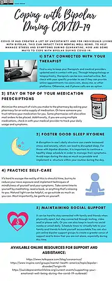 WHO and CDC issued guidelines for minimizing mental health issues during the pandemic. The summarized guidelines are:[31][32][33]