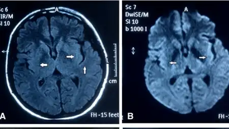 Images indicate bilateral hyper-intensity of medial temporal lobe, insular lobe and basal ganglia