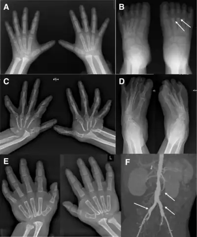 - ↑ Bhavani, GS; Shah, H; Shukla, A; Gupta, N; Gowrishankar, K; Rao, AP; Kabra, M; Agarwal, M; Ranganath, P; Ekbote, AV; Phadke, SR; Kamath, A; Dalal, A; Girisha, KM (February 2016). "Clinical and mutation profile of multicentric osteolysis nodulosis and arthropathy". American Journal of Medical Genetics. Part A. 170A (2): 410–417. doi:10.1002/ajmg.a.37447. PMID 26601801.