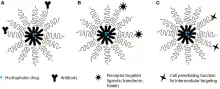 Active targeting involves the incorporation of targeting modules such as ligands or antibodies on the surface of nanocarriers that are specific to certain types of cells around the body. Nanocarriers have such a high surface-area to volume ratio allowing for multiple ligands to be incorporated on their surfaces.[3] These targeting modules allow for the nanocarriers to be incorporated directly inside of cells, but also have some drawbacks. Ligands may cause nanocarriers to become slightly more toxic due to non-specific binding, and positive charges on ligands may decrease drug delivery efficiency once inside of cells.[8][12] Active targeting has been shown to help overcome multi-drug resistance in tumor cells.[13]