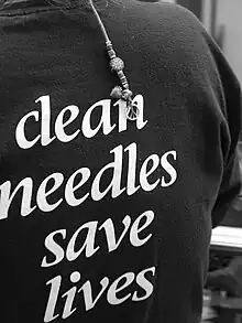 Many states criminalized needle possession without a prescription, arresting people as they left underground needle exchange efforts.[36] In some jurisdictions, such as New York, needle exchange activists challenged the laws in court, with judges ruling that their actions were justified by a "necessity defense" which permits breaking of a law to prevent an imminent harm.[37] In other jurisdictions where syringe possession without a prescription remained illegal, physician-based prescription programmes have shown promise.[38] Epidemiological research demonstrating that syringe access programmes are both effective and cost-effective helped to change state and local NEP-operation laws, as well as the status of syringe possession more broadly.[39] For example, between 1989 and 1992, three exchanges in New York City tagged syringes to help demonstrate rates of return prior to the legalization of the approach.[40]