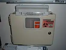 There are several electrically powered needle-removers on the market now. The Disintegrator Needle Destruction Device, offered by American Scientific Resources (ASFX), uses plasma arch technology to destroy the needle, kill pathogens and blunt the syringe. Designed to be used with only one hand, this device completely eliminates the sharp. One model from Techno Fab uses a regular electrical short-circuit to melt the needle, while another needle-remover, seen at CarePathways.com, uses a plasma arc to melt the needle.[23][24] A unique needle-remover design is the Needle Remover Device, designed by the Program for Appropriate Technology in Health (PATH). It uses two handles that are squeezed together to slide two circular blades across each other, which cuts the hub from the syringe. It is also reusable, and its target cost is about $15.[3] Another needle-removers currently on the market is Advanced Care Products's Clip&Stor, which uses a hand-powered clipper action to remove the needle.[25] The cost of the Clip&Stor is about seven dollars. There is also the BD Hub Cutter, which uses a squeezing hand motion to cut the syringe. The edges of the squeezable parts have blades that do the actual cutting. However, unlike a regular needle-remover, the BD Hub Cutter cuts the syringe at the hub so the needle is completely separated from the syringe. As a result, the risk of a contaminated puncture is completely eliminated because no needle shards remain on the syringe. The Hub Cutter is not reusable though, and disposal of the whole unit must occur.[26] The cost of the Hub Cutter is about four dollars.[1]