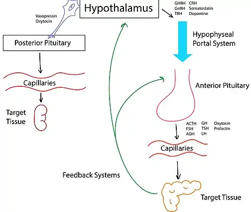 Hypothalamic interaction with the posterior and anterior pituitary glands. The hypothalamus produces the hormones oxytocin and vasopressin in its endocrine cells (left). These are released at nerve endings in the posterior pituitary gland and then secreted into the systemic circulation. The hypothalamus releases tropic hormones into the hypophyseal portal system to the anterior pituitary (right). The anterior pituitary then secretes trophic hormones into the circulation which elicit different responses from various target tissues. These responses then signal back to the hypothalamus and anterior pituitary to either stop producing or continue to produce their precursor signals.