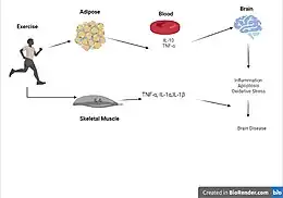 Exercise can help protect the mind and body by maintaining the brain’s internal environment, focusing on recruiting anti-inflammatory cytokines, and activating cellular processes that proactively protect against damage while also initiating recovery mechanisms. The ability of physical activity to stimulate immune defenses against neuroinflammation-related diseases has been observed in recent clinical studies. The application of various exercises under a range of different conditions resulted in higher neurological metabolism, stronger protection against free radicals, and stronger neuroplasticity against neurological diseases. The resulting increase in brain function was due to the induced change in gene expression, increase in trophic factors, and reduction in pro-inflammatory cytokines.[53]