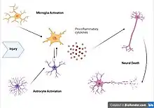 Cytokines are a class of proteins regulating inflammation, cell signaling, and various cell processes such as growth and survival.[10] Chemokines are a subset of cytokines that regulate cell migration, such as attracting immune cells to a site of infection or injury.[10] Various cell types in the brain may produce cytokines and chemokines such as microglia, astrocytes, endothelial cells, and other glial cells. Physiologically, chemokines and cytokines function as neuromodulators that regulate inflammation and development. In the healthy brain, cells secrete cytokines to produce a local inflammatory environment to recruit microglia and clear the infection or injury. However, in neuroinflammation, cells may have sustained release of cytokines and chemokines which may compromise the blood–brain barrier.[11] Peripheral immune cells are called to the site of injury via these cytokines and may now migrate across the compromised blood brain barrier into the brain. Common cytokines produced in response to brain injury include: interleukin-6 (IL-6), which is produced during astrogliosis, and interleukin-1 beta (IL-1β) and tumor necrosis factor alpha (TNF-α), which can induce neuronal cytotoxicity. Although the pro-inflammatory cytokines may cause cell death and secondary tissue damage, they are necessary to repair the damaged tissue.[12] For example, TNF-α causes neurotoxicity at early stages of neuroinflammation, but contributes to tissue growth at later stages of inflammation.