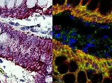 An example of the application of this technique in neuroscience is the immunolabeling of antigens like NGF-Inducible Large External glycoprotein (NILE-GF), choline acetyltransferase, parvalbumin, and neurofilament protein.[15] All of these antigens are present in specific neuronal cell types. With these we can define anatomical circuits with a high degree of resolution, and understand the role of some proteins and cells in the nervous system, as well as the location of that same proteins and cells.