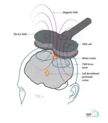 TMS utilises a magnetic field to induce a brief electrical impulse which stimulates neurons within the cerebral cortex.[13] This targets the cerebral cortex through electromagnetic induction. Its general mechanism is applying a magnetic field in the form of coil to the scalp which then influences your motor cortex.[14] TMS itself has variations in terms of magnet strength, pulse frequency, pulse patterns (rTMS), magnetic coil type and stimulation target.[15] Depending on its target use, these factors can be manipulated specific to the target disease.[16] This is a method which is FDA approved and primarily utilized for mental illnesses such as depression.[16]