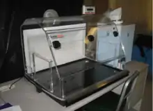 The mining industry still has one of the highest rates of fatalities of any industry.[54] There are a range of hazards present in surface and underground mining operations. In surface mining, leading hazards include such issues as geological instability,[55] contact with plant and equipment, rock blasting, thermal environments (heat and cold), respiratory health (black lung), etc.[56] In underground mining, operational hazards include respiratory health, explosions and gas (particularly in coal mine operations), geological instability, electrical equipment, contact with plant and equipment, heat stress, inrush of bodies of water, falls from height, confined spaces. ionising radiation, etc.[57]