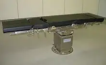 An operating table, sometimes called operating room table, is the table on which the patient lies during a surgical operation.[1] This surgical equipment is usually found inside the surgery room of a hospital.[2] A specialized type of operating table is call a surgical fracture table (or trauma table) is designed to allow an orthopedic surgeon to perform common orthopedic procedures such as hip fractures, pelvic fractures, tibial fractures, fibula fractures, and anterior approach total hip arthroplasty.[3] Modern surgical fracture tables cost >US$200,000, but the costs can be reduced to make them more accessible using distributed digital fabrication with 3D printing of open-source hardware designs.[4]