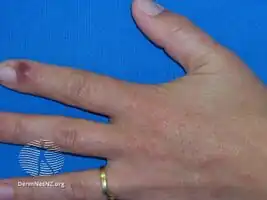 Symptoms include a purulent-appearing papule locally and generally no systemic symptoms. Infected locations can include the finger, hand, arm, face and even the penis (caused by infection either from contact with the hand during urination or from bestiality).[6]
