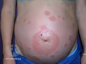 - 1 2 Roth, MM (1 February 2011). "Pregnancy dermatoses: diagnosis, management, and controversies". American journal of clinical dermatology. 12 (1): 25–41. doi:10.2165/11532010-000000000-00000. PMID 21110524.