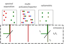 Strategies for multicolor localization microscopy. Left: spectral separation. Center: multiple activators (STORM). Right: Ratiometric imaging