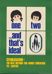 The first phase started with the launch of the Singapore Family Planning and Population Board in 1966 to aggressively promote family planning after Singapore faced "post-war food and housing shortages".[1] SFPPB targeted low-socioeconomic status individuals, particularly females, and worked to encourage contraceptive use, such as condoms and birth control.[1] The SFPPB advocated for small families, establishing the "Stop-at-Two" program, which encouraged and benefited two-children families and subsequent sterilisation . SFPPB also opened more clinics to better the health and welfare of families.[1] Aside from encouraging small families, policies set in place by the government during the "Stop-at Two" era de-incentivized having more than two children; civil workers were not paid for maternity leave after their second child, children's hospital fees were higher for third and subsequent children, top school choices were given to only children with parents who had been sterilized before the age of 40, and sterilization itself was rewarded with seven days of paid leave.[2]