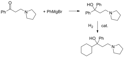 Procyclidine, 1-cyclohexyl-1-phenyl-3-pyrrolidinopropan-1-ol, is synthesized in exactly the same manner as was seen for trihexyphenidyl, except this time the linear synthesis begins with the preparation of 3-(1-pyrrolidino)propiophenone.