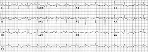The primary use of the ECG is to rule out other causes of chest pain.[61] An electrocardiogram (ECG) is routinely done on people with chest pain to quickly diagnose myocardial infarctions (heart attacks), an important differential diagnosis in an individual with chest pain. While certain ECG changes may occur with PE, none are specific enough to confirm or sensitive enough to rule out the diagnosis.[61] An ECG may show signs of right heart strain or acute cor pulmonale in cases of large PEs — the classic signs are a large S wave in lead I, a large Q wave in lead III, and an inverted T wave in lead III (S1Q3T3), which occurs in 12–50% of people with the diagnosis, yet also occurs in 12% without the diagnosis.[62][63]