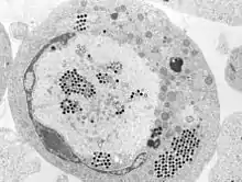 | Transmission electron micrograph of ranaviruses (dark hexagons) gathering at the cell border and leaving the cell via a process called "budding". | |