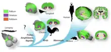 Finally, recent studies based on paleontological data or comparative anatomical evidence strongly suggest that the neocortex was already present in the earliest emerging mammals.[10] In addition, although non-mammals do not have a neocortex in the true sense (that is, a structure comprising part of the forebrain roof, or pallium, consisting of six characteristic layers of neurons), they possess pallial regions, and some parts of the pallium are considered homologous to the mammalian neocortex. While these areas lack the characteristic six neocortical layers, birds and reptiles generally possess three layers in the dorsal pallium (the homolog of the mammalian neocortex).[10][13] The telencephalon of birds and mammals makes neuroanatomical connections with other telecencephalic structures[10] like those made by neocortex. It mediates similar functions such as perception, learning and memory, decision making, motor control, conceptual thinking.