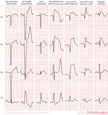 1. 1 2 3 4 5 Erwin Christian, de Bliek (17 February 2018). "ST elevation: Differential diagnosis and caveats. A comprehensive review to help distinguish ST elevation myocardial infarction from nonischemic etiologies of ST elevation". Turkish Journal of Emergency Medicine. 18 (1): 1–10. doi:10.1016/j.tjem.2018.01.008. PMC 6009807. PMID 29942875.