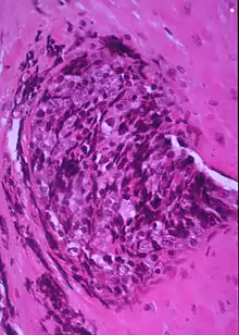 In histopathology, a small-blue-round-cell tumour (abbreviated SBRCT), also known as a small-round-blue-cell tumor (SRBCT) or a small-round-cell tumour (SRCT), is any one of a group of malignant neoplasms that have a characteristic appearance under the microscope, i.e. consisting of small round cells that stain blue on routine H&E stained sections.