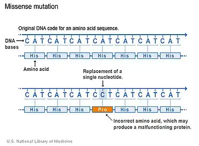 SLOS is an autosomal recessive disorder.[6] More than 130 different types of mutations have been identified.[2] Missense mutations (single nucleotide change resulting in a code for a different amino acid) are the most common, accounting for 87.6% of the SLOS spectrum. These typically reduce the function of the enzyme but may not inhibit it completely. Much depends on the nature of the mutation (i.e. which amino acid is replaced and where). Null mutations are much less common, these mutations produce either a completely dysfunctional enzyme, or no enzyme at all.[6] Thus, missense mutations may be more common overall because they are less lethal than nonsense mutations; nonsense mutations may simply result in spontaneous abortion.