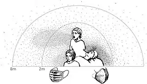 Coughs and sneezes can spread airborne droplets up to ~8 meters (26 ft). Speaking can spread droplets up to ~2 meters (6.6 ft).[6] It may be difficult to maintain these distances. For a masked person, or even one sneezing or coughing into a tissue or elbow, these distances are reduced.[8]