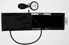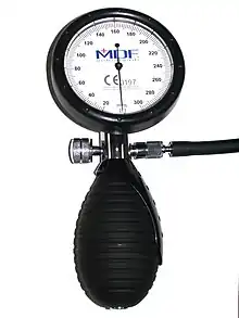 A sphygmomanometer (/ˌsfɪɡmoʊməˈnɒmɪtər/ SFIG-moh-mə-NO-mi-tər), also known as a blood pressure monitor, or blood pressure gauge, is a device used to measure blood pressure, composed of an inflatable cuff to collapse and then release the artery under the cuff in a controlled manner,[1] and a mercury or aneroid manometer to measure the pressure. Manual sphygmomanometers are used with a stethoscope when using the auscultatory technique.