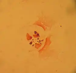 S. aureus (/ˌstæfɪləˈkɒkəs ˈɔːriəs, -l-/,[15][16] Greek σταφυλόκοκκος, "grape-cluster berry", Latin aureus, "golden") is a facultative anaerobic, Gram-positive coccal (round) bacterium also known as "golden staph" and "oro staphira". S. aureus is nonmotile and does not form spores.[17] In medical literature, the bacterium is often referred to as S. aureus, Staph aureus or Staph a..[18] S. aureus appears as staphylococci (grape-like clusters) when viewed through a microscope, and has large, round, golden-yellow colonies, often with hemolysis, when grown on blood agar plates.[19] S. aureus reproduces asexually by binary fission. Complete separation of the daughter cells is mediated by S. aureus autolysin, and in its absence or targeted inhibition, the daughter cells remain attached to one another and appear as clusters.[20]