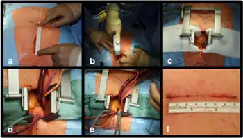Median sternotomy is a type of surgical procedure in which a vertical inline incision is made along the sternum, after which the sternum itself is divided using a sternal saw.[1] This procedure provides access to the heart and lungs for surgical procedures such as heart transplant, lung transplant, corrective surgery for congenital heart defects, or coronary artery bypass surgery.[2][3][4]