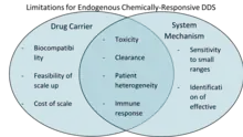 There are many limitations that exist within the field of endogenous chemically responsive drug delivery systems that prevent many of these products from approved to be used in a clinical setting. One of the primary challenges of endogenous chemically responsive drug delivery is the inability to address or overcome patient heterogeneity. Patient heterogeneity describes the naturally-occurring difference between patient biology, such as differences in tumor pH for the same cancer and blood concentrations of redox reagents.[1] The targeting of many chemical properties in pathological tissues is also restricted by a small range of fluctuation of the chemical property, which prevents researchers from being able to safely and specifically target that diseased tissue and stimulus due to small windows of sensitivity that have yet to be optimized.[5][13] Other important limitations to consider include the formulation of the drug carrier, which can affect the clearance rate and biodistribution of the drug carrier and decrease therapeutic efficacy due to size, shape, or effective penetration of the tissue by the drug carrier.[5][13] Biocompatibility and toxicity of the drug carrier formulation also poses a significant challenge to the development of the field, so future studies need to be conducted using inherently biocompatible materials to ensure feasibility and safety of these proposed delivery systems. Finally, cost of production and the scalability of the creation of stimuli responsive drug delivery systems remains an enormous barrier between the development and clinical use of these delivery systems.
