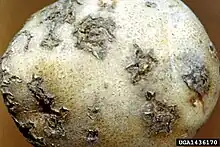 At least four other species of Streptomyces also cause diseases on potato tubers.[8] The most widespread species other than S. scabiei are S. turgidiscabies and S. acidiscabies, which can be distinguished based on their morphology, the way they utilise food sources and their 16S RNA sequences.[2] Unlike S. scabiei, S. acidiscabies is predominantly seed-borne rather than soil-borne and be suppressed using insecticides and nematicides, suggesting that microfauna play a role in its transmission.[13] In 2003 three other species of Streptomyces that cause common scab symptoms were isolated in Korea and named S. luridiscabiei, S. puniciscabiei and S. niveiscabiei. They differ from S. scabiei by having spores that are of different colours.[14] S. ipomoea causes a similar disease on sweet potato tubers.[15]