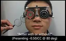 Subjective Refraction is a technique to determine the combination of lenses that will provide the best corrected visual acuity (BCVA).[1] It is a clinical examination used by orthoptists, optometrists and ophthalmologists to determine a patient's need for refractive correction, in the form of glasses or contact lenses. The aim is to improve current unaided vision or vision with current glasses. Glasses must also be comfortable visually. The sharpest final refraction is not always the final script the patient wears comfortably.