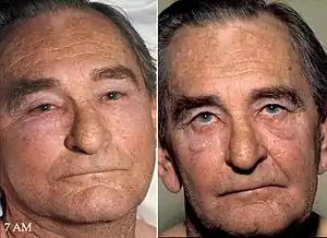 | Superior vena cava syndrome in a person with bronchogenic carcinoma. Note the swelling of his face first thing in the morning (left) and its resolution after being upright all day (right). | |