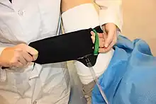In the 2000s, the silicon ring tourniquet, or elastic ring tourniquet, was developed by Noam Gavriely, a professor of medicine and former emergency physician.[22][23] The tourniquet consists of an elastic ring made of silicone, stockinet, and pull straps made from ribbon that are used to roll the device onto the limb. The silicone ring tourniquet exsanguinates the blood from the limb while the device is being rolled on, and then occludes the limb once the desired occlusion location is reached.[7] Unlike the historical mechanical tourniquets, the device reduces the risk of nerve paralysis.[24][25] The surgical tourniquet version of the device is completely sterile, and provides improved surgical accessibility due to its narrow profile that results in a larger surgical field. It has been found to be a safe alternative method for most orthopedic limb procedures, but it does not completely replace the use of contemporary tourniquet devices.[26][27] More recently the silicone ring tourniquet has been used in the fields of emergency medicine and vascular procedures.[23][28]