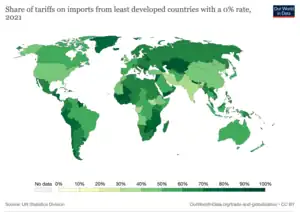 Target 10.a has one indicator. Indicator 10.a.1 is the "Proportion of tariff lines applied to imports from least developed countries and developing countries with zero-tariff".[13]