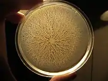 - ↑ Julkowska, D.; Obuchowski, M; Holland, IB; Séror, SJ (2004). "Branched swarming patterns on a synthetic medium formed by wild-type Bacillus subtilis strain 3610: detection of different cellular morphologies and constellations of cells as the complex architecture develops". Microbiology. 150 (Pt 6): 1839–49. doi:10.1099/mic.0.27061-0. PMID 15184570.