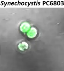 Like all cyanobacteria, Synechocystis branches on the evolutionary tree from its ancestral root, Gloeobacter violaceus.[2] Synechocystis is not diazotrophic, and is closely related to another model organism, Cyanothece ATCC 51442.[3] It has been suggested that originally Synechocystis possessed the ability to fix atmospheric nitrogen, but lost the genes required for the process.[4]