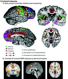 Schematic and FMRI of cortical areas involved in pain processing which are similar to areas that are involved in tactile hallucinations.