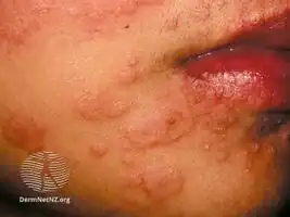 - Dark centre of small papule, vesicle, or bulla (iris)