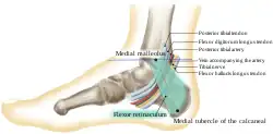 The roof of the tarsal tunnel is formed by the flexor retinaculum of the foot.[1] The floor of the tarsal tunnel is formed by the medial malleolus and the calcaneus.[1]