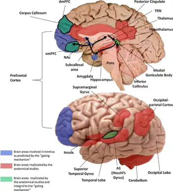 - ↑ Adjamian, Peyman; Hall, Deborah A.; Palmer, Alan R.; Allan, Thomas W.; Langers, Dave R. M. (September 2014). "Neuroanatomical abnormalities in chronic tinnitus in the human brain". Neuroscience and Biobehavioral Reviews. 45: 119–133. doi:10.1016/j.neubiorev.2014.05.013. ISSN 1873-7528. Retrieved 21 August 2023.