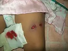 A gunshot wound to the left thigh showing entry and exit wound of a 3 year old girl.